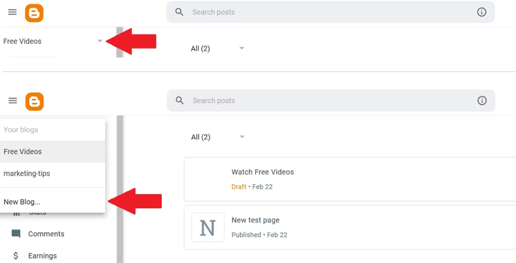 • Click the arrow-down icon and pick New Blog
